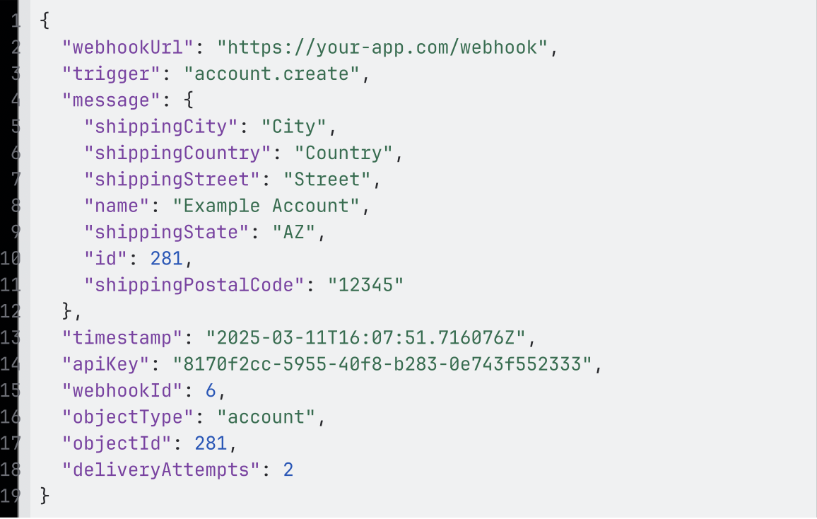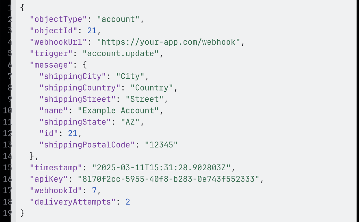 Below are sample webhook payloads you can expect to receive for different triggers.