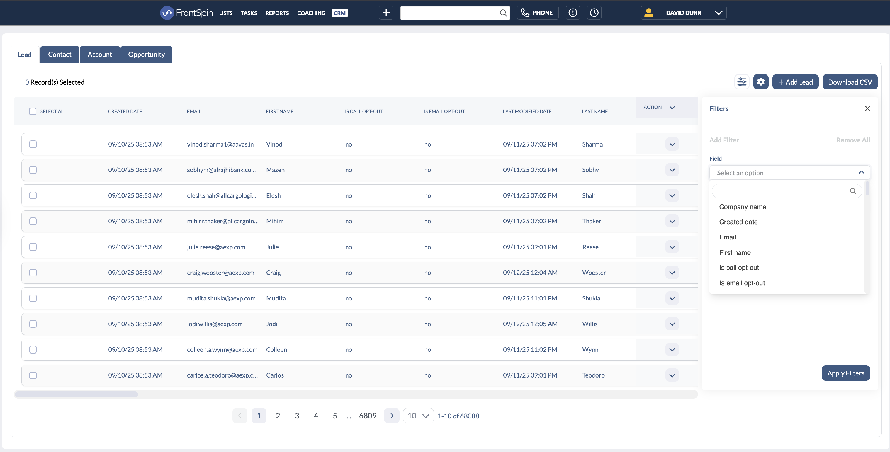 Frontspin includes a powerful filtering system that lets you quickly find and segment records based on the criteria that matter most to your team. You can filter across leads and contacts to build targeted views and workflows.